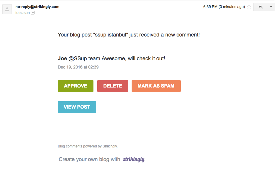 You can manage your blog comments on either your desktop and mobile device. Clicking [APPROVE] or any of the buttons in the email will take you to the blog post editor to take the action: